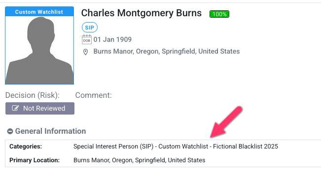 Profiles in a custom watchlists are generalised as Special Interest Person (SIP) or Special Interest Entity (SIE) with the name of the list displayed as a watchlist category.