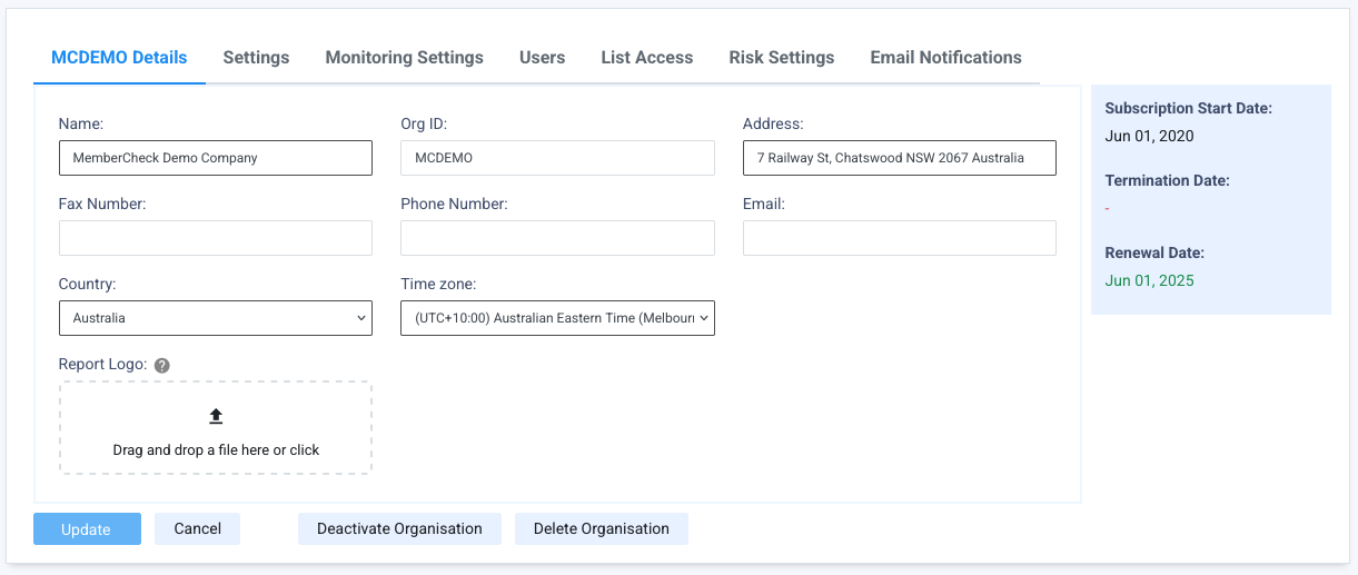 Time zone | Mandatory | - | Time zone is automatically set based on the selected Country, however it can be changed to cater for different regions with different time zone settings. This time zone will be used for all dates and times displayed for the organisation, with the exception of the Activity Report, which is based on Australian Eastern Standard/Daylight Saving Time (UTC +10/11). Time zone is displayed against the Last Login date and time on the MemberCheck banner, for reference For users that are assigned to an organisation belonging to a group of organisations with different time zones, the time zone displayed against the Last Login date and time will be that of the group's parent organisation. |