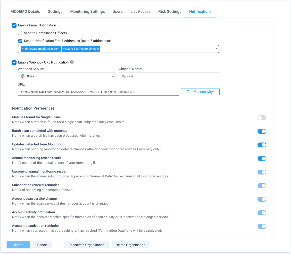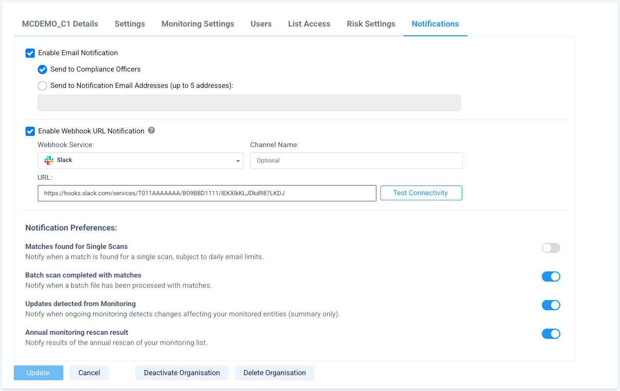 Enable email notifications of monitoring updates | Check this option to receive email notifications if changes are detected in the watchlist which may affect monitored individuals and or companies. Emails will be sent to the Compliance Officer or Organisation Email. This is not checked or enabled by default. |