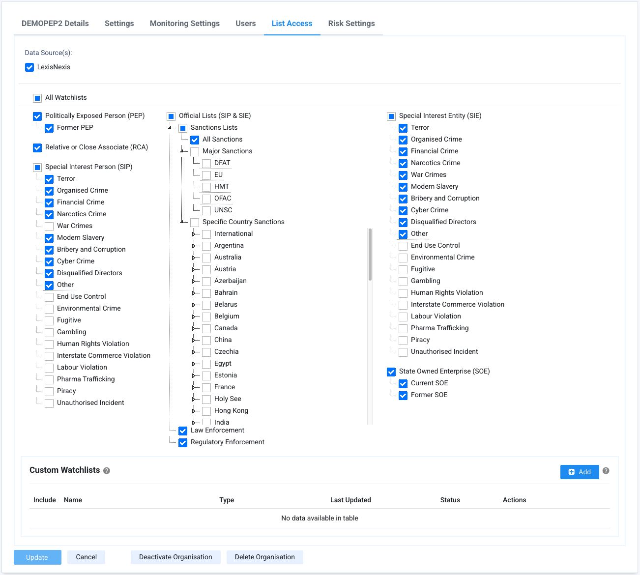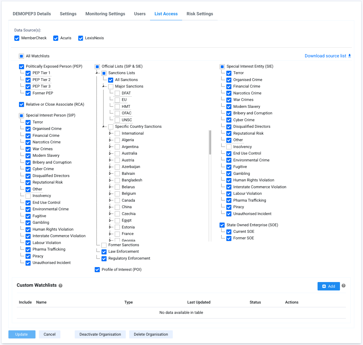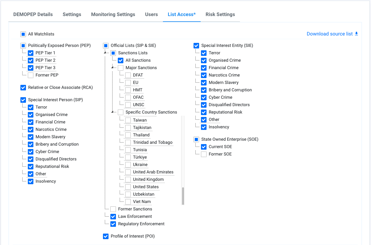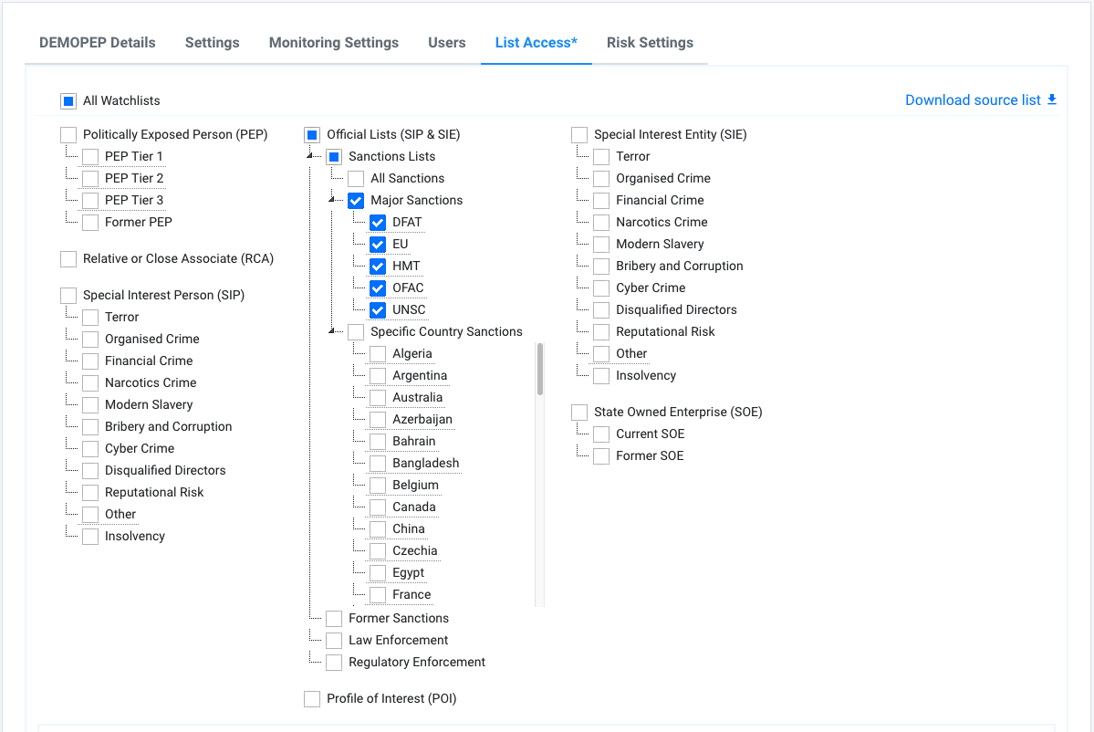 The List Access tab enables you to view and configure the scope of PEP and Sanctions screening for the chosen organisation or suborganisation.