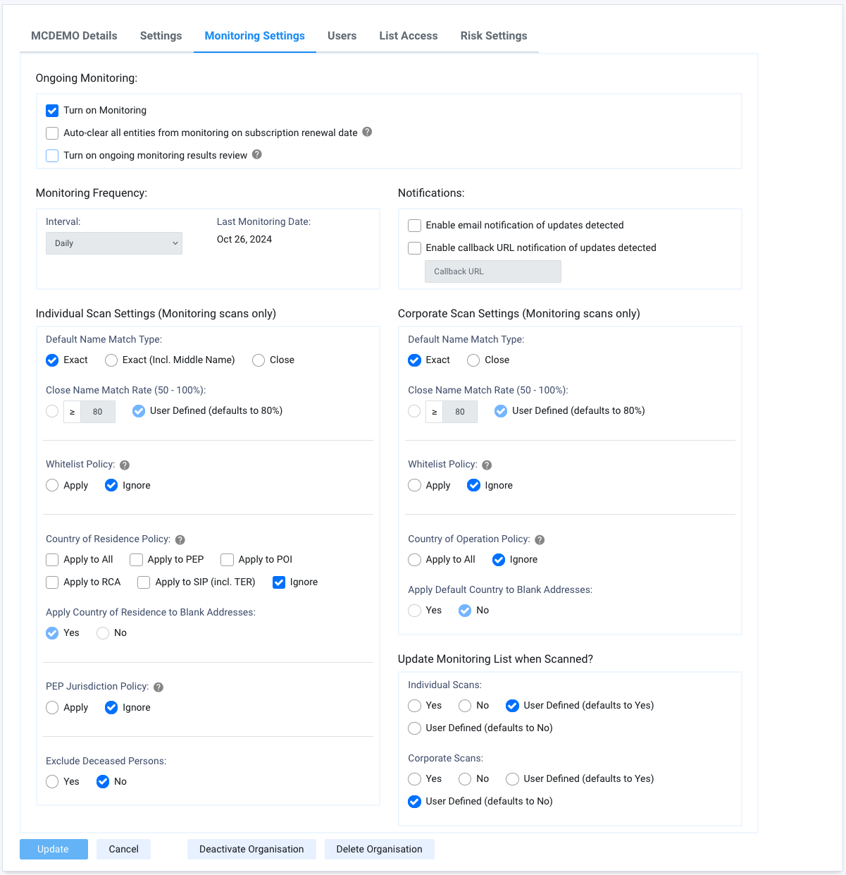 Define scan setting options for ongoing monitoring. These can be set to be the same as Settings or adjusted to cater for variations depending on your organisation's AML/CTF obligations.