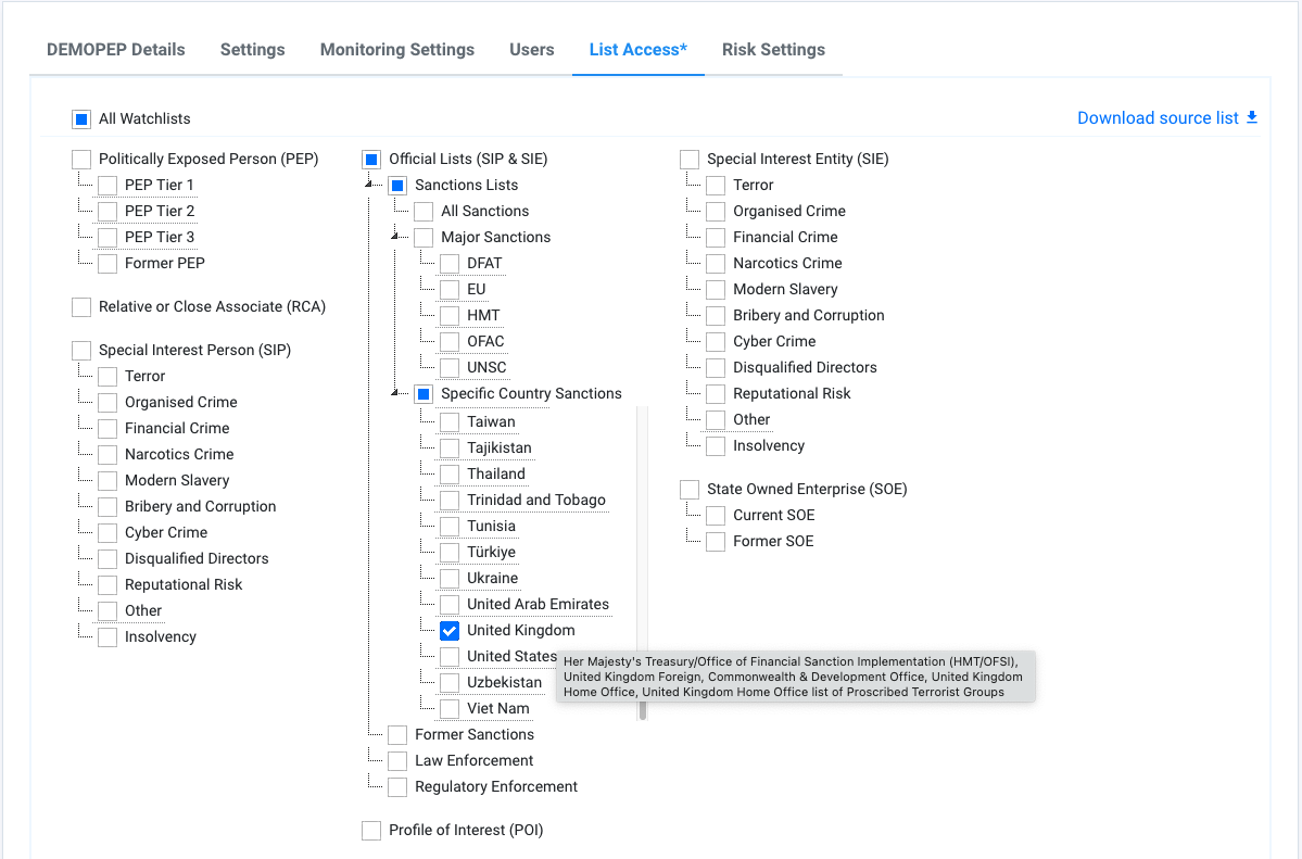 Example of List Access setup to screen against the United Kingdom sanctions only. You can view the list of sanctions on mouse hover over the country jurisdiction.