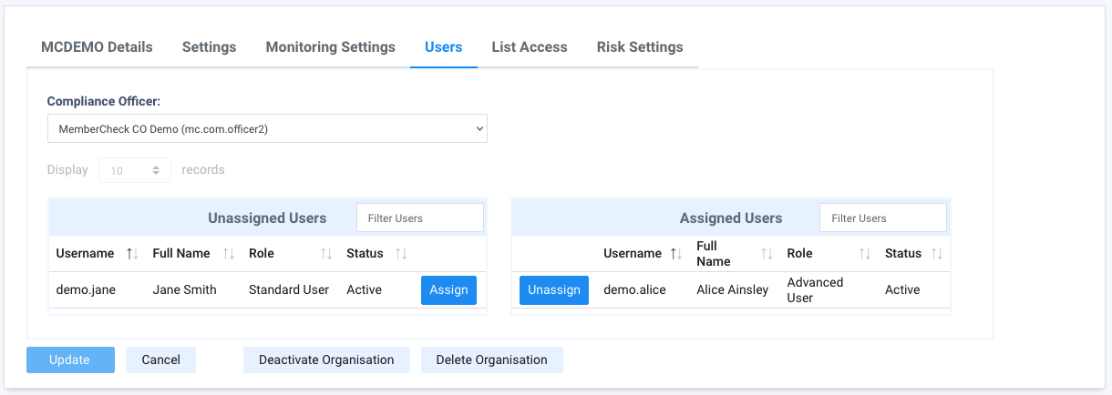 Unassigned Users | List of users associated with the primary organisation which are not assigned to the selected organisation or suborganisation. |