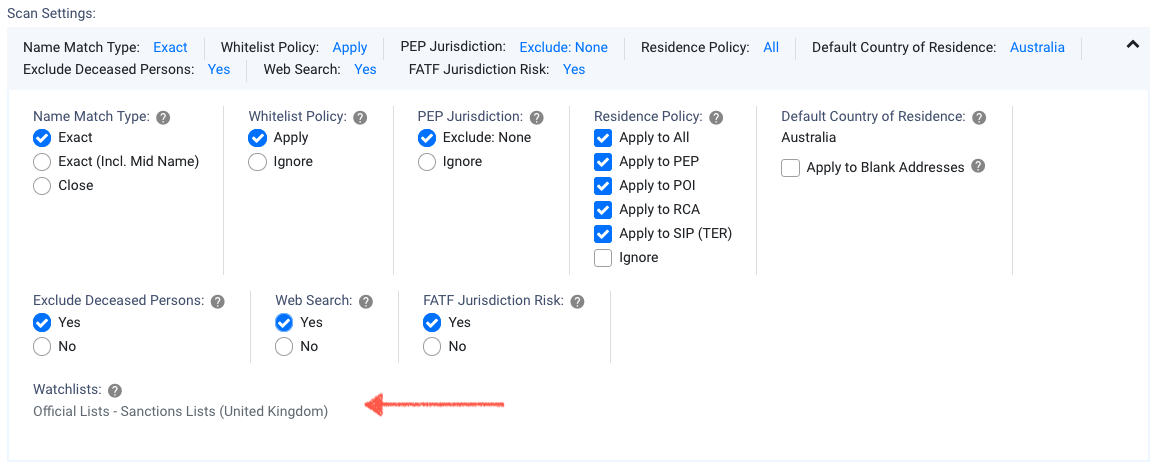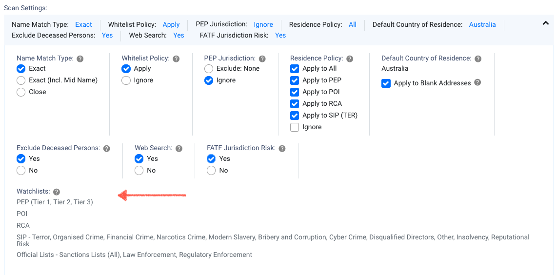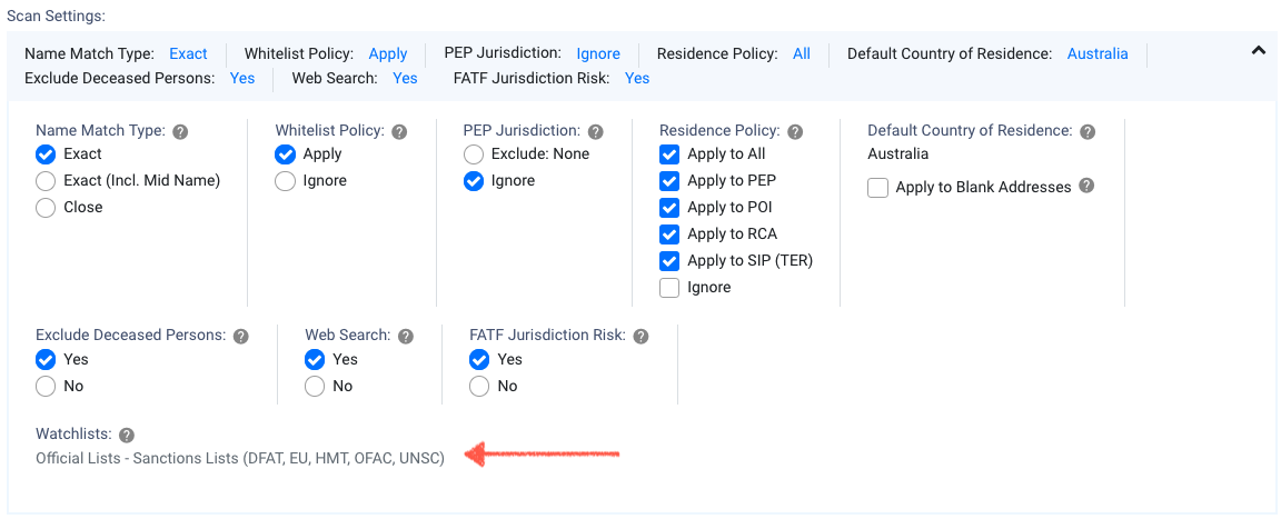 Whitelist Policy | Mandatory | A setting that ensures previous due diligence decisions, i.e, a member is determined to not be a watchlist entity, are taken into account in future scans. Therefore, previous match results will not be returned as a match. Options are: